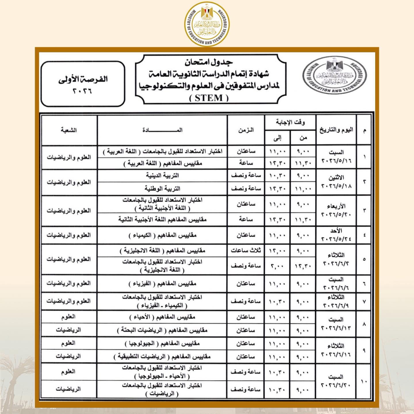 جدول امتحانات الثانوية العامة 2026 علمي رياضة نظام جديد